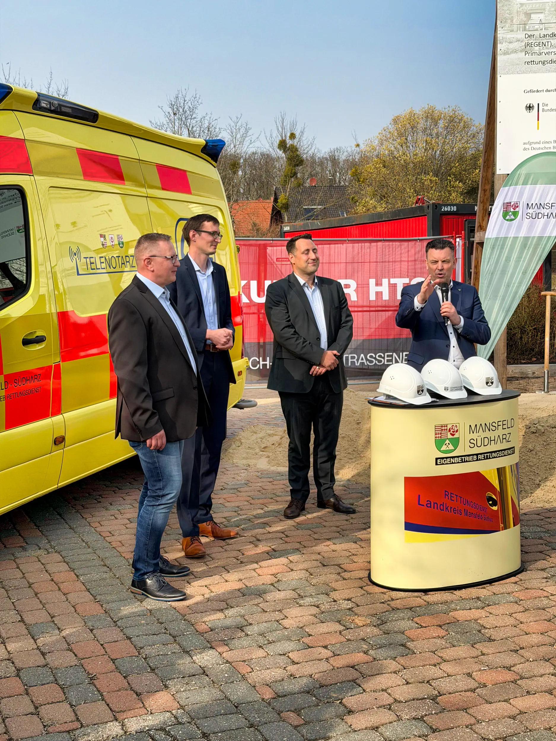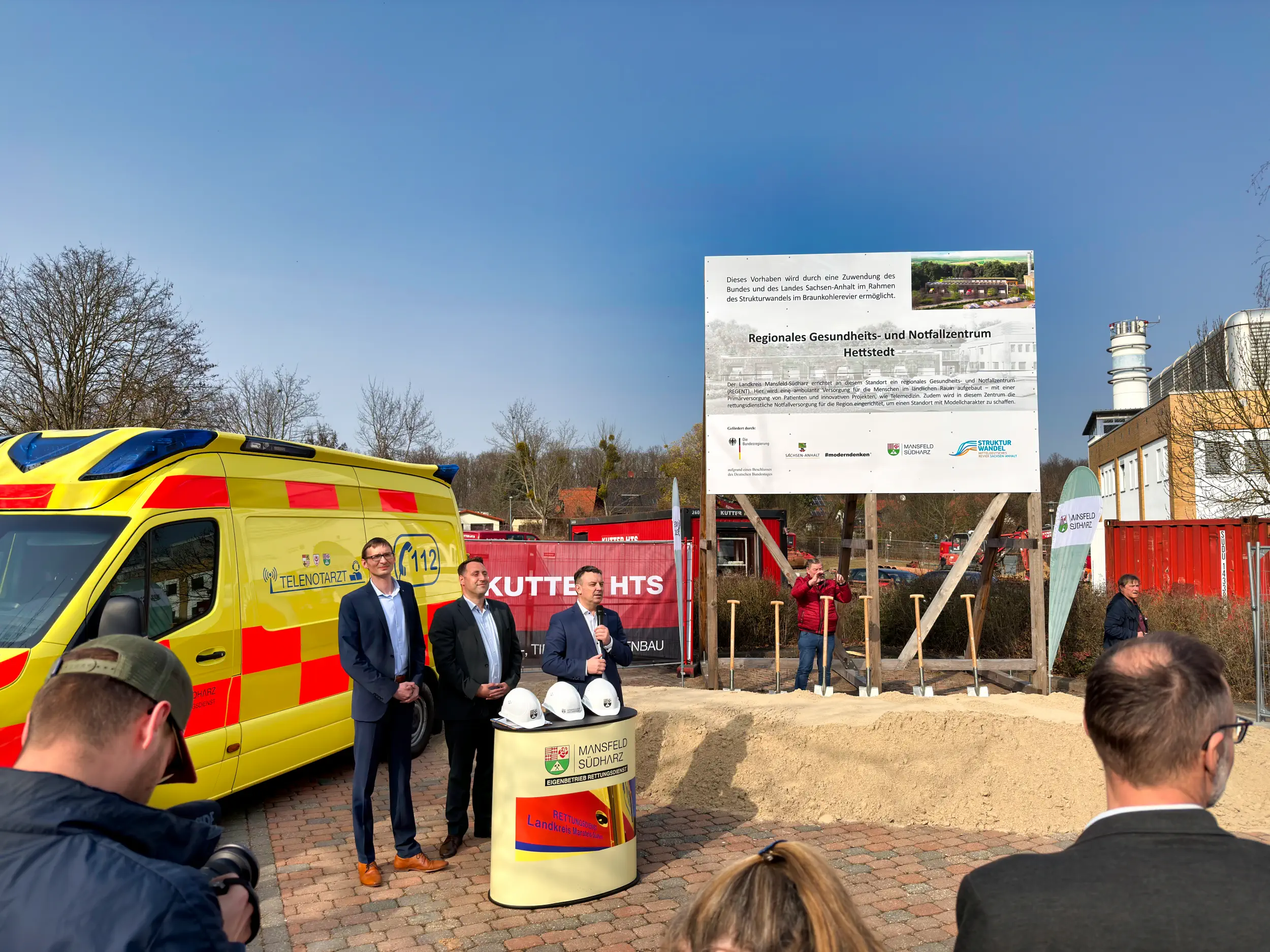 Hettstedt, den 10. März 2026 – Mit dem heutigen feierlichen Spatenstich hat der Landkreis Mansfeld-Südharz den offiziellen Beginn der baulichen Umsetzung für ein wegweisendes Infrastrukturprojekt markiert. In Hettstedt entsteht das neue Regionale Gesundheits- und Notfallzentrum, kurz REGENT, in direkter Kombination mit der neuen Hauptrettungswache des Eigenbetrieb Rettungsdienst. Nachdem am 12. November 2024 bereits das Bauschild enthüllt wurde, markiert der heutige Tag den entscheidenden Übergang von der Planungs- in die Realisierungsphase.